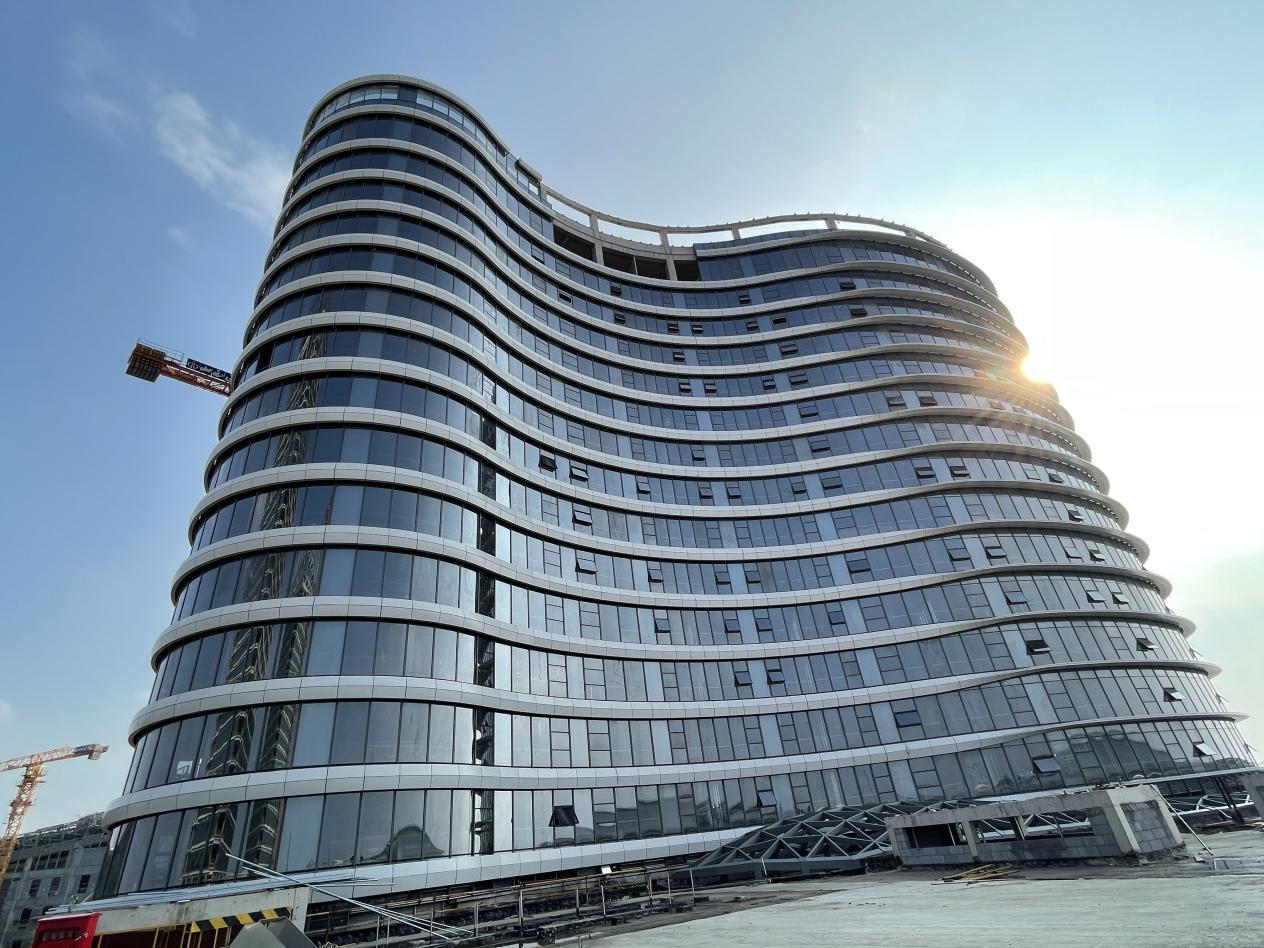 2号酒店项目100多米的高空上,技术娴熟的幕墙装置工人们穿梭在钢板之间,正在装置一块块约1吨重的玻璃幕墙。大型吊车忙碌地将屋顶所需质料精准运送到位。屋顶上,吊装到位的钢结构网架在火花四溅的焊花中被焊牢、成型。建筑外立面上,“蜘蛛侠”一样的工人师傅们系着宁静带,自上而下搭设着幕墙面层需要的“龙骨”。