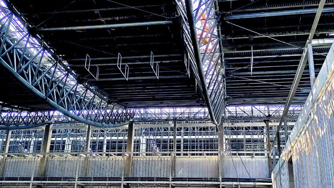 目前,1#连廊钢结构顺利完成装置,正在进行展厅防火涂料涂装、卸货通道钢结构装置事情。