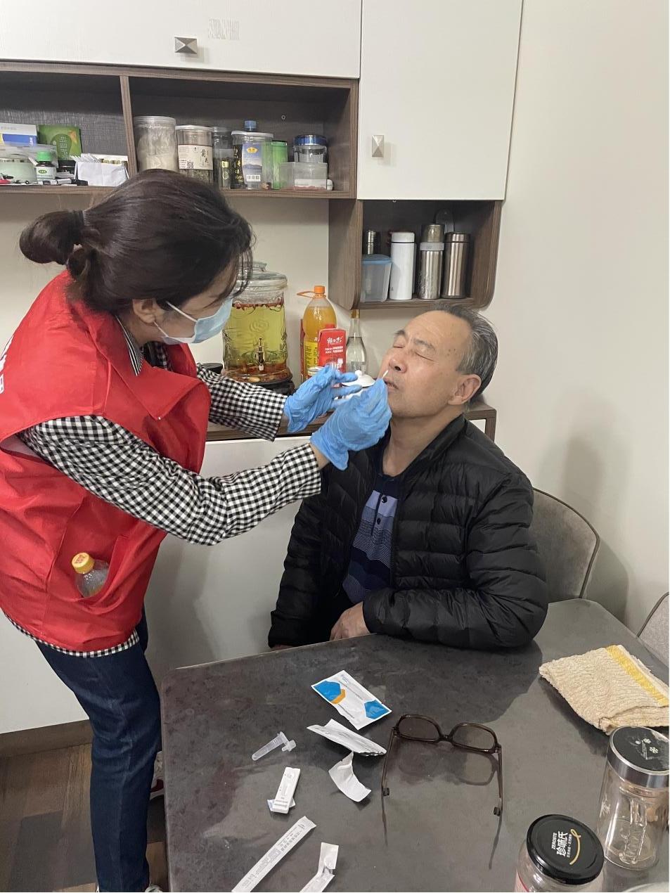 (志愿者协助社区事情人员为居民发放自测新冠抗原试剂盒,资助老人幼儿检测,确保不漏一户一人。)