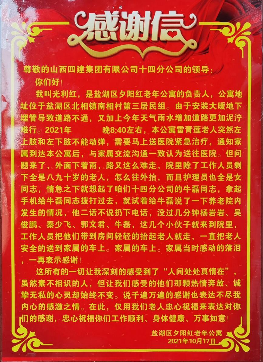 近日,运都会盐湖区夕阳红老年公寓卖力人为公司承建的北相镇镇区集中供热新宝会工程项目部送来了锦旗和谢谢信,向项目人员致以浓浓谢意。