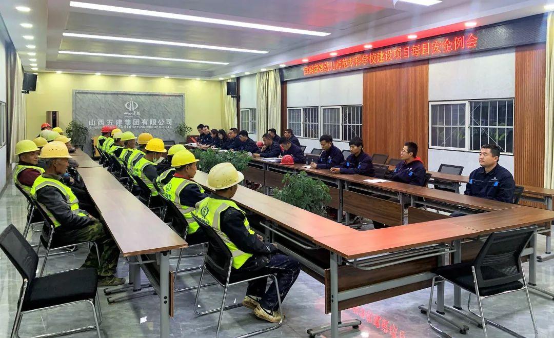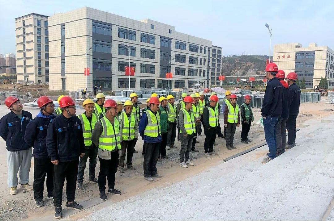 清晨,吕梁高等幼儿师范专科学校项目当班所有人员,穿好工服,整理完毕,开始了忙碌的一天。荟萃哨声响起,大伙已经列队站好。现场施工治理人员对当天作业的工友讲解作业宁静注意事项,并对当天作业内容、作业情况以及现场保存的危险源进行宁静技术交底。这是项目每日进行的班前宁静教育,自项目开工以来,从未间断。
