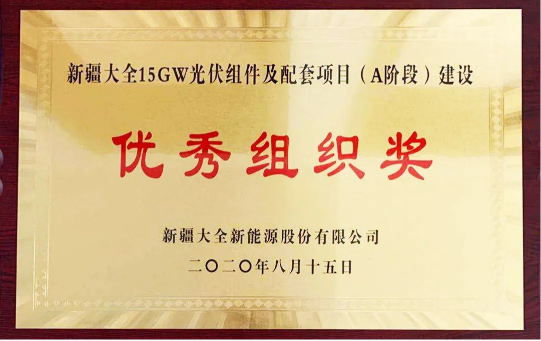 近日,公司承建的新疆15GW光伏组件及配套项目部受到业主单位新疆大全新能源股份有限公司表扬,被授予“优秀施工单位”和“优秀组织奖”荣誉称呼。