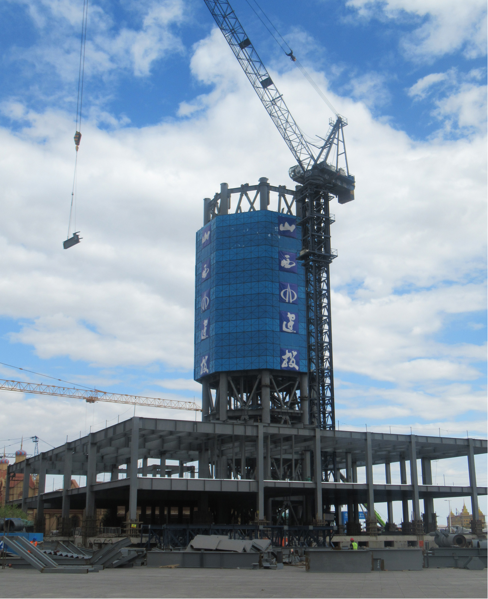 该项目建筑面积19032平方米,地上主体及塔身为钢结构工程,地下室为框架混凝土结构,建筑结构形式为高耸结构,建成后将成为集餐饮、旅行、娱乐、休闲、购物为一体的大型综合体旅行项目。目前,项目旅行塔主塔已施工至75米,抵达主塔屋面总高度的一半,预计9月底完成主体结构装置。
