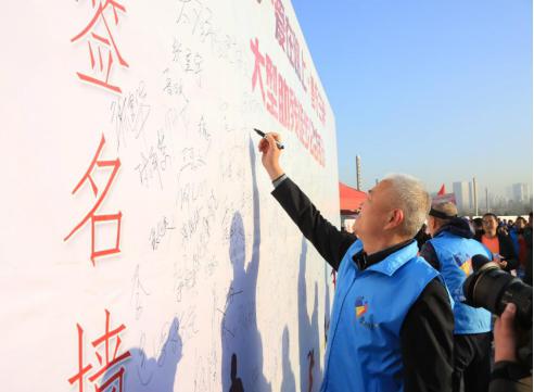 山西建投四建集团党委书记、董事长杜锐在签名墙上签字