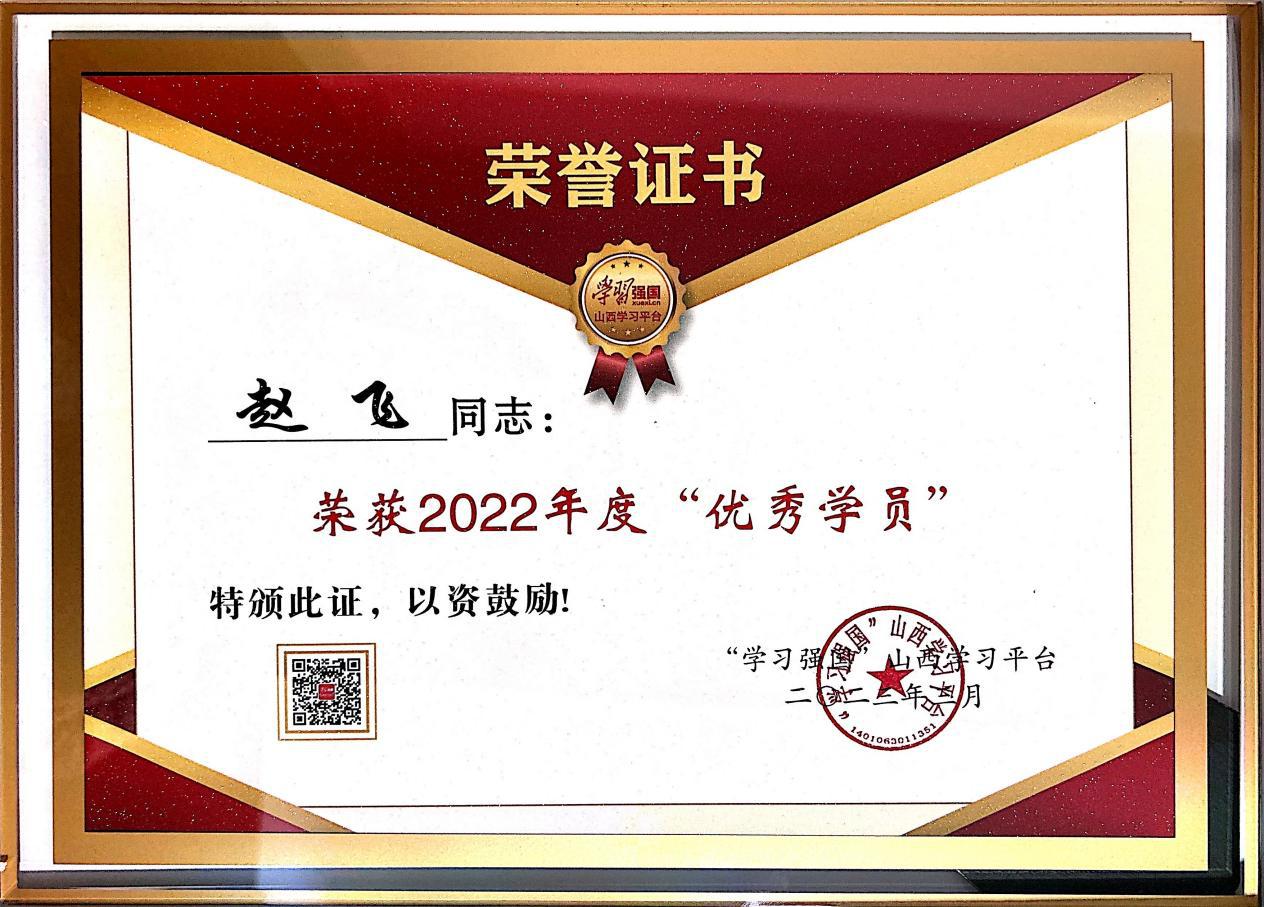 在2022年度“学习强国”山西学习之星、强国志愿之星、优秀事情者、模范组织评选运动中,集团职工赵飞荣获山西学习平台优秀学员称呼。