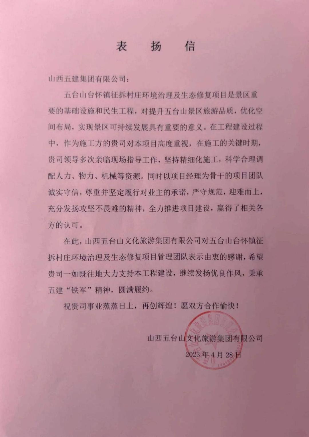 五台山台怀镇征拆乡村情况治理及生态修复项目收到来自山西五台山文化旅游集团有限公司的谢谢信,信中对以项目经理为主干的项目团队老实守信,坚定履行对业主的允许,严守规范,迎难而上,充分发挥攻坚不畏难的精神,全力推进项目新宝会表达了充分肯定与衷心谢谢。