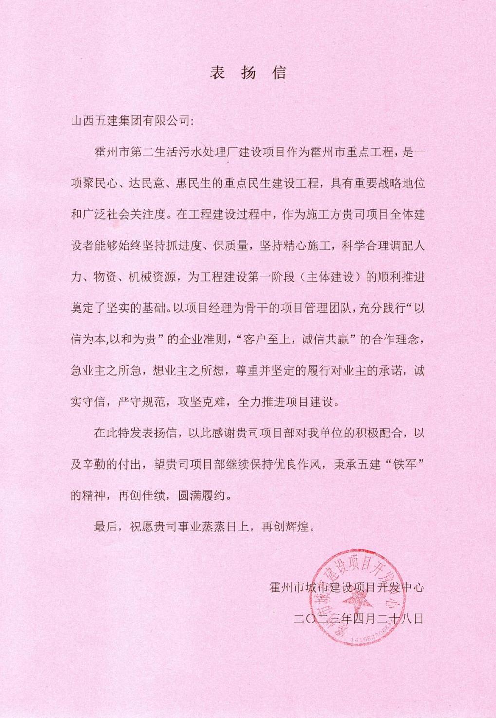 霍州市第二污水处理厂新宝会项目收到来自霍州市都会新宝会项目开发中心的谢谢信,信中对项目团队老实守信、严守规范、攻坚克难、全力推进项目新宝会体现谢谢。