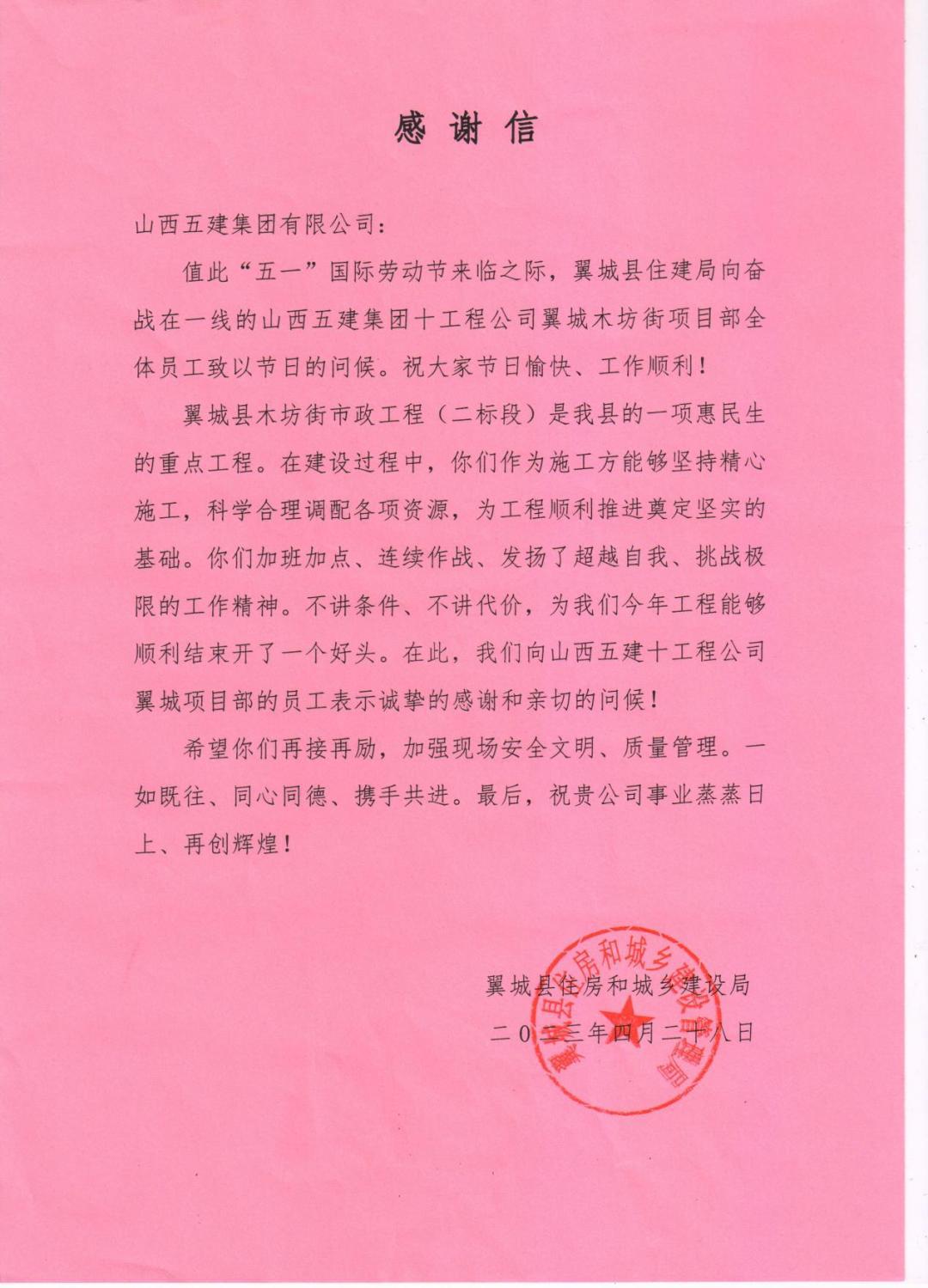 翼城县木坊街市政工程(二标段)项目收到来自翼城县住房和城乡新宝会局的谢谢信
