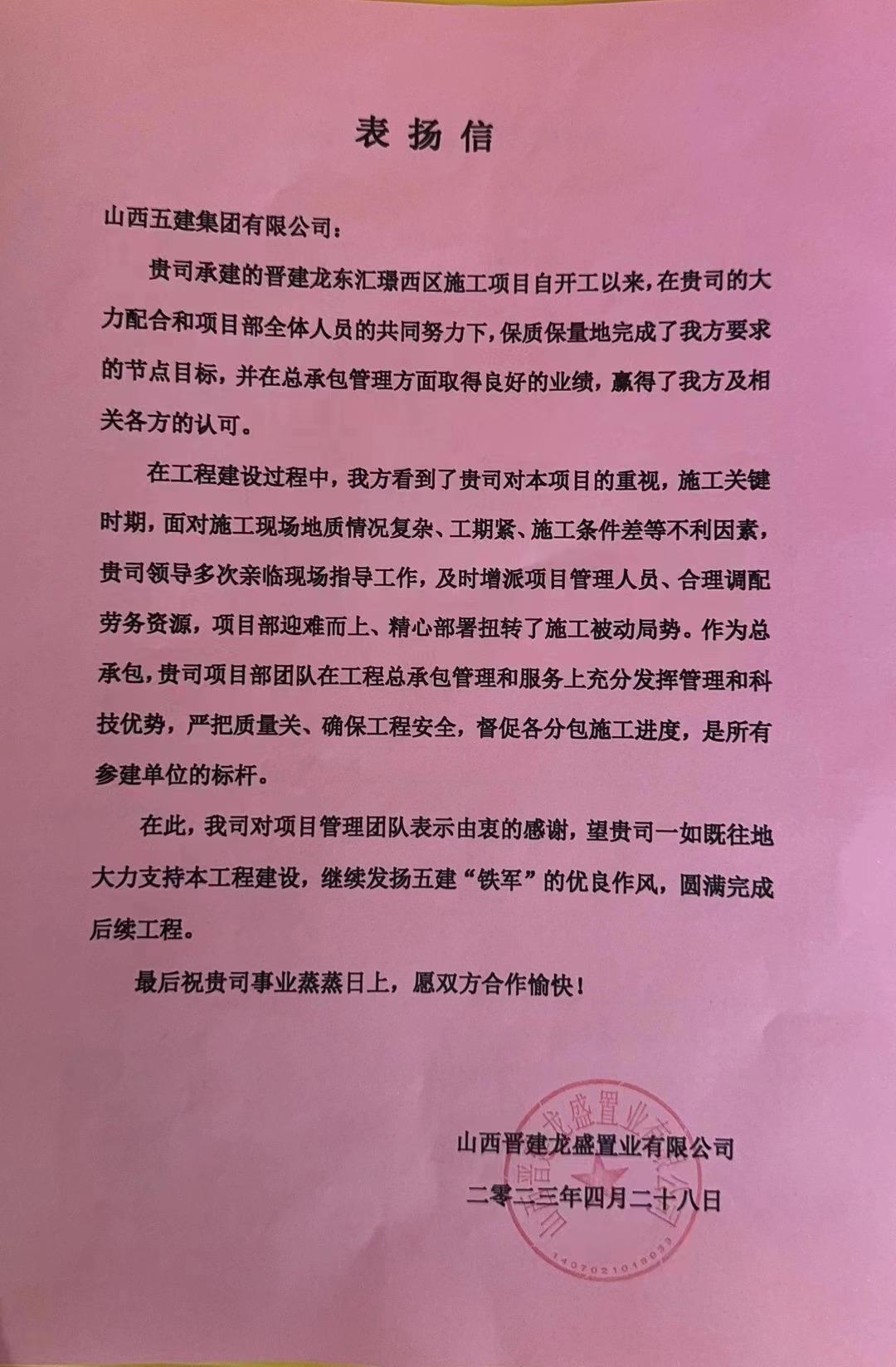 晋建·龙东汇璟(一期)西区施工项目收到来自山西晋建龙盛置业有限公司谢谢信,信中对项目团队迎难而上、精心安排,合理调配劳务资源,扭转施工被动局势,保质保量完成节点目标体现衷心谢谢。